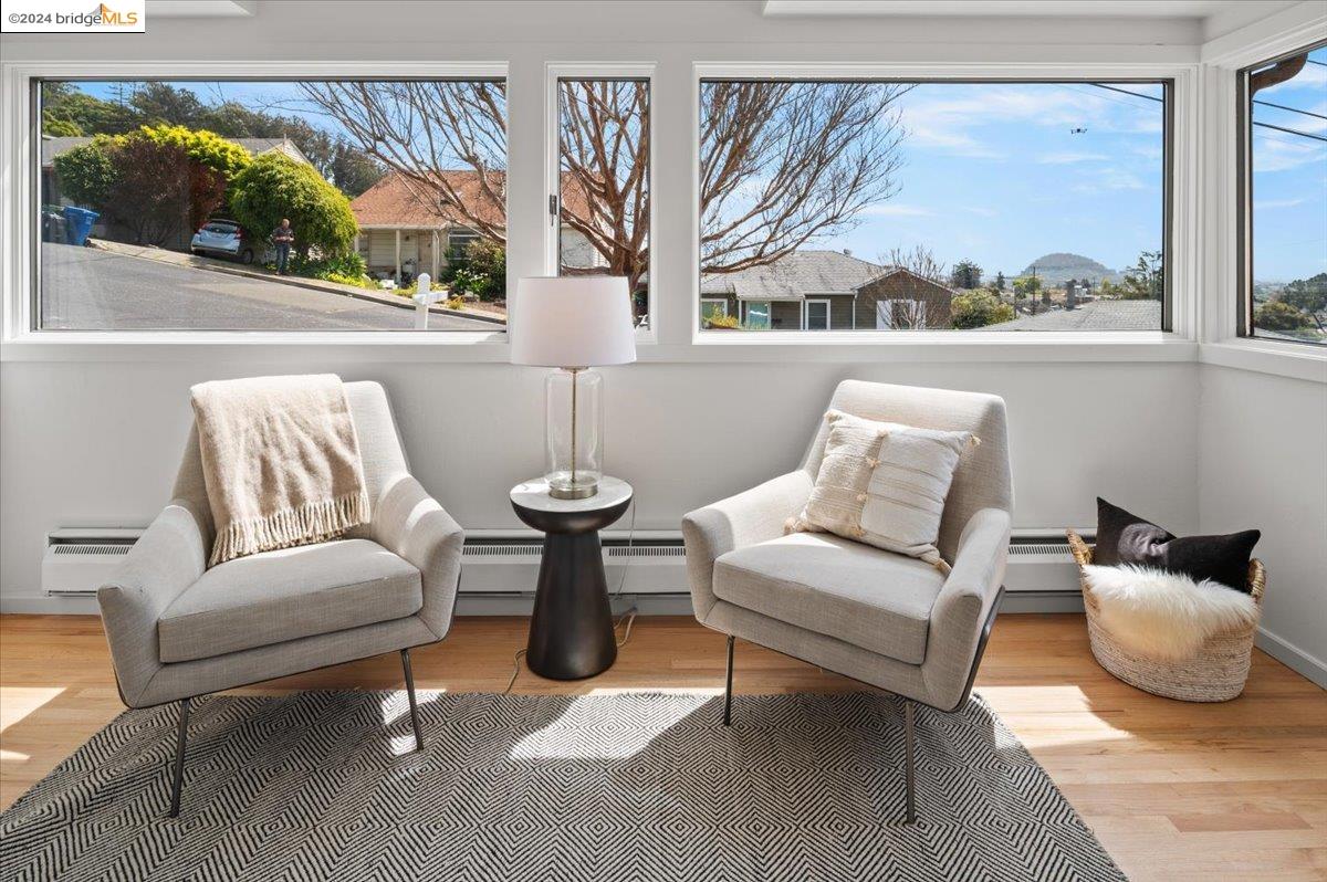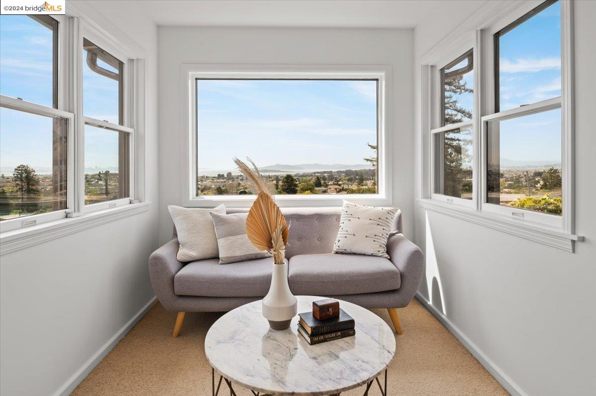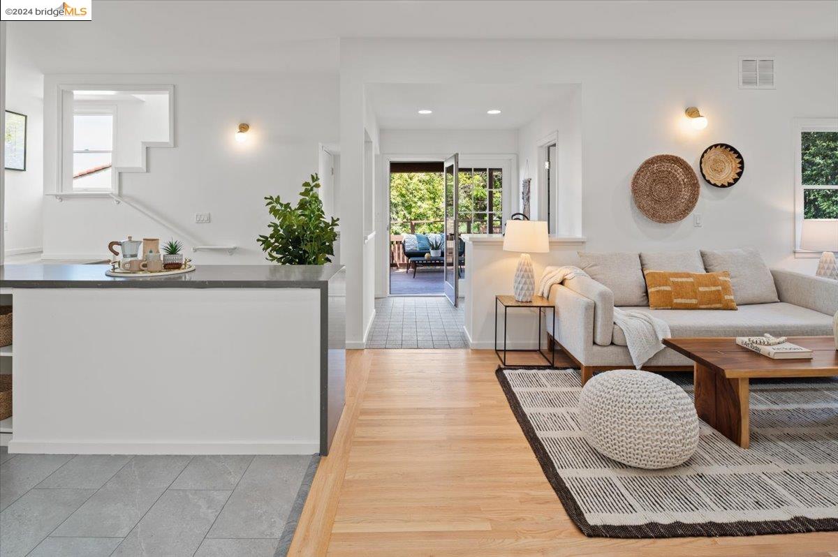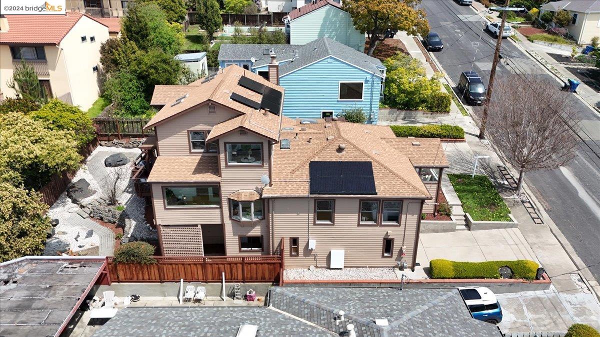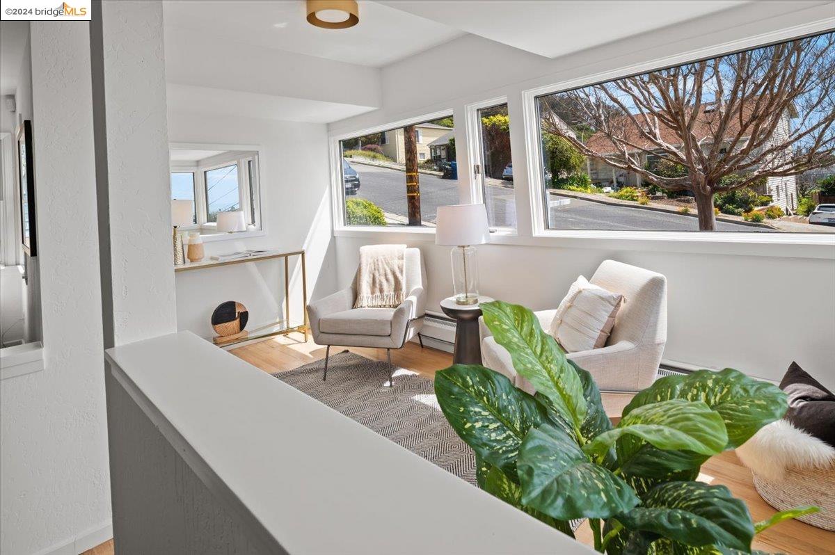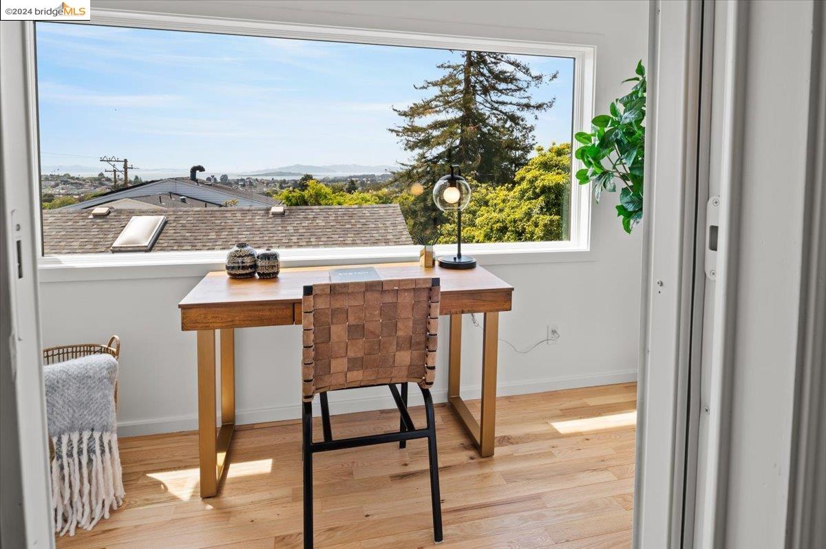 Elevate your lifestyle with breathtaking views and spacious luxury. This stunning residence offers panoramic vistas of the bay, Golden Gate Bridge, and San Francisco skyline from multiple rooms, providing a daily dose of inspiration and tranquility. Boasting over 2500 square feet of living space, this home is bathed in natural light thanks to abundant windows and skylights that showcase its attractive architectural lines. Step inside to discover a brand-new kitchen, complete with custom cabinets, quartz countertops, and stainless-steel appliances, including a gas range and breakfast bar. The kitchen seamlessly flows into the family room with a cozy fireplace, creating the perfect space for gatherings and relaxation. Entertain with ease on the sizeable deck and yard off the kitchen/family room. The main level features a living room, sunroom, dining room and a separate office space, all illuminated by recessed modern lighting and featuring refinished hardwood floors. The main level also offers two bedrooms and a full bath, as well as a convenient half bath with stackable washer/dryer. Upstairs, the generous primary suite awaits, complete with panoramic views, a sitting area, large soaking tub, standalone shower, and walk-in closet. Additional features include a second laundry area, storage space, two-car garage, seismic retrofitting and a new solar system with battery back-up. Enjoy easy commuting with proximity to shopping, BART, freeways, and the Richmond ferry terminal. Plus, indulge in nearby recreational opportunities at parks, Hillside Natural Area, Tilden Park, Wildcat Canyon Regional Park, and regional shorelines. Experience the pinnacle of California living at 7307 Gladys Avenue—a home where every moment is filled with beauty, comfort, and possibility.