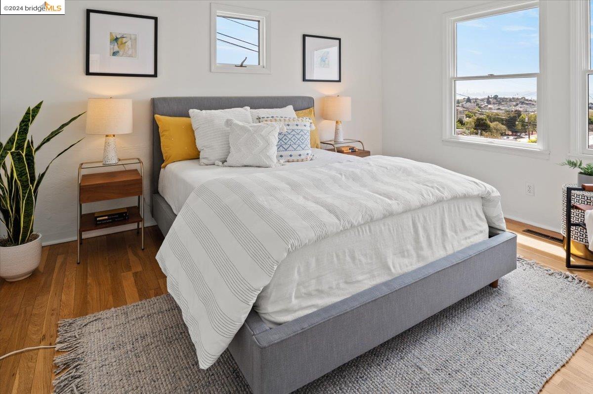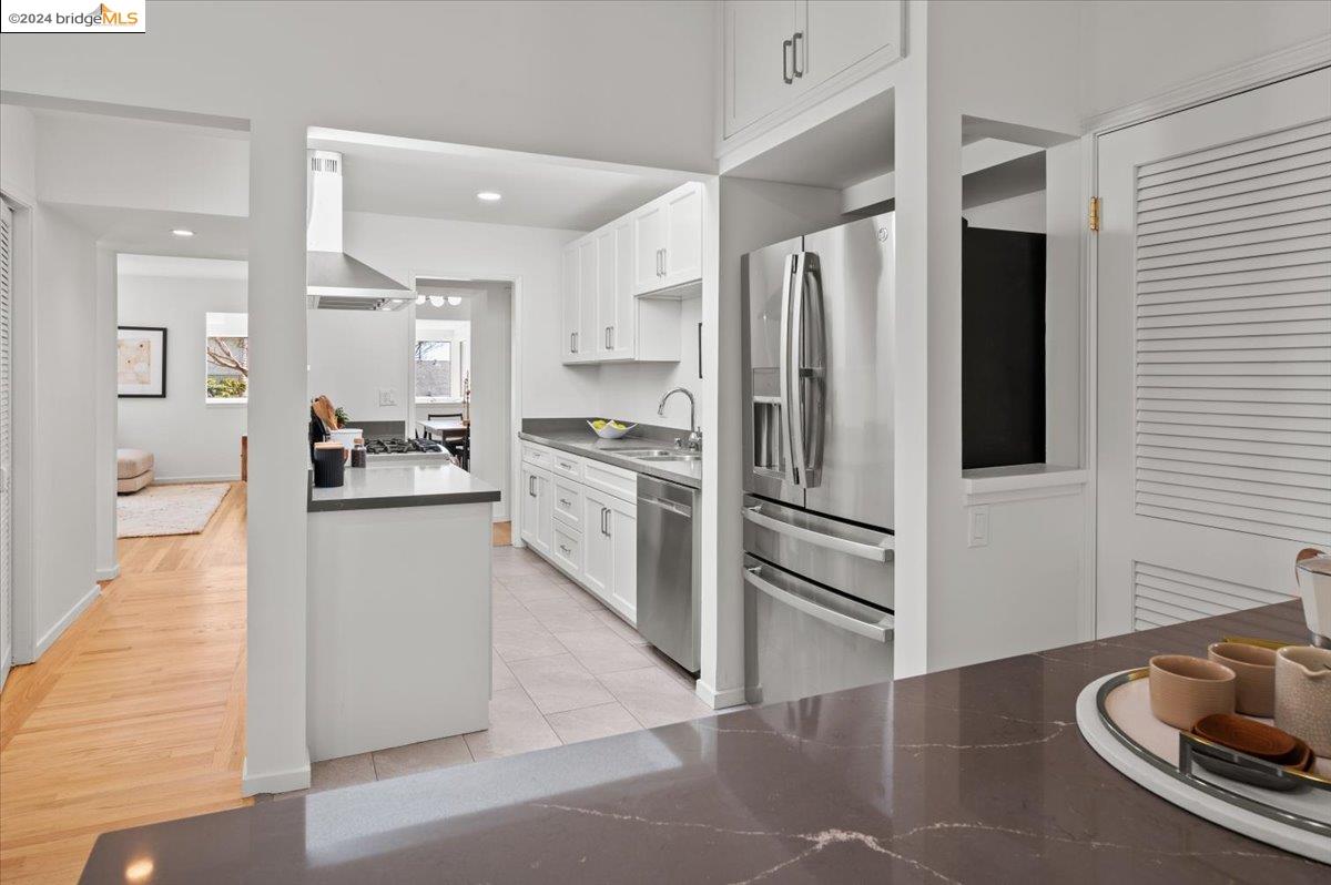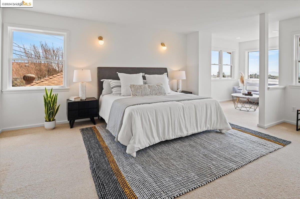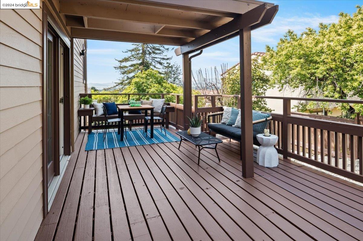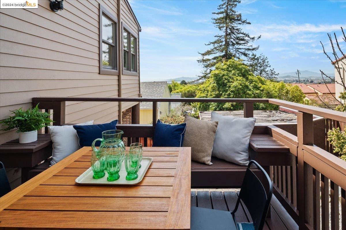 Elevate your lifestyle with breathtaking views and spacious luxury. This stunning residence offers panoramic vistas of the bay, Golden Gate Bridge, and San Francisco skyline from multiple rooms, providing a daily dose of inspiration and tranquility. Boasting over 2500 square feet of living space, this home is bathed in natural light thanks to abundant windows and skylights that showcase its attractive architectural lines. Step inside to discover a brand-new kitchen, complete with custom cabinets, quartz countertops, and stainless-steel appliances, including a gas range and breakfast bar. The kitchen seamlessly flows into the family room with a cozy fireplace, creating the perfect space for gatherings and relaxation. Entertain with ease on the sizeable deck and yard off the kitchen/family room. The main level features a living room, sunroom, dining room and a separate office space, all illuminated by recessed modern lighting and featuring refinished hardwood floors. The main level also offers two bedrooms and a full bath, as well as a convenient half bath with stackable washer/dryer. Upstairs, the generous primary suite awaits, complete with panoramic views, a sitting area, large soaking tub, standalone shower, and walk-in closet. Additional features include a second laundry area, storage space, two-car garage, seismic retrofitting and a new solar system with battery back-up. Enjoy easy commuting with proximity to shopping, BART, freeways, and the Richmond ferry terminal. Plus, indulge in nearby recreational opportunities at parks, Hillside Natural Area, Tilden Park, Wildcat Canyon Regional Park, and regional shorelines. Experience the pinnacle of California living at 7307 Gladys Avenue—a home where every moment is filled with beauty, comfort, and possibility.